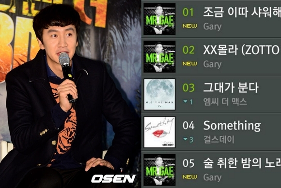 개리는 앞서 이날 0시 첫 번째 솔로앨범 '미스터개(MR.GAE)'를 공개, 타이틀곡 '조금 이따 샤워해'로 국내 최대 음원사이트 멜론을 비롯해 엠넷닷컴, 벅스, 올레뮤직, 소리바다, 네이버뮤직, 싸이월드, 지니 등 주요차트 9곳 이상에서 왕좌를 꿰찼다.