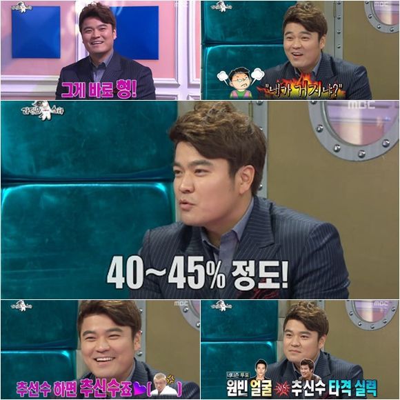 추신수는 지난 15일 방송된 MBC 예능프로그램 '황금어장-라디오스타' 신수 형 특집에 출연했다. ‘라스’에서 가장 먼저 연락이 온 것이 그가 밝힌 출연 이유. 그러면서도 추신수는 열혈 야구팬 김구라에게 “김구라 씨를 직접 만나고 싶어서 ‘라스’에 출연했다. 그런데 저는 83년생이 아니라 82년생이다”라고 자신을 83년생으로 소개했던 김구라의 멘트를 곧바로 정정했다.