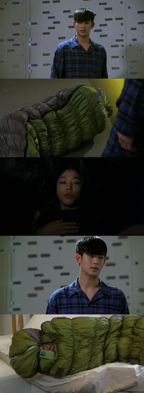 이날 방송에서 도민준은 천송이와의 키스 이후 열병을 앓았다. 이에 천송이는 도민준의 침대 아래에서 침낭에 누운 채 잠을 청했던 것.