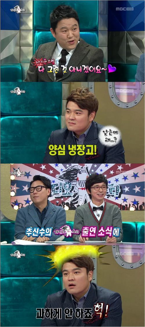 김국진, 윤종신, 김구라, 슈퍼주니어 규현의 몰아세우기와 어르고 달래기는 추신수의 정신을 혼미하게 했다. 원빈의 얼굴이냐, 추신수의 타격 실력이냐를 두고 심각하게 고민하는 MC들이나, 연봉이 1370억 원이나 되니 회식비를 대고 출연료를 반납하라는 얼토당토하지 않은 이야기를 하는 것은 시작에 불과했다.
