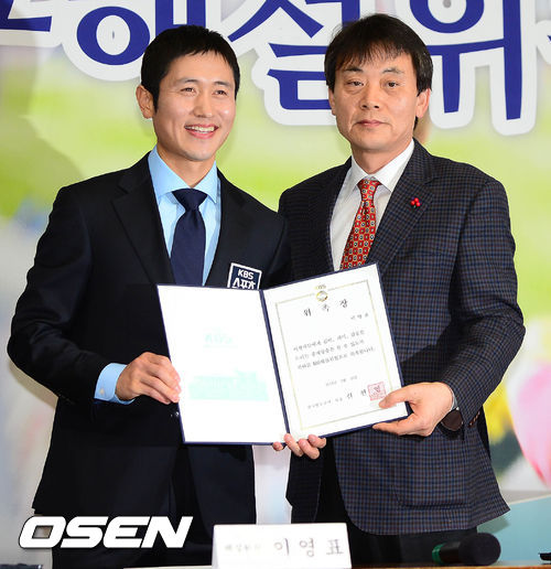 이영표가 16일 오후 서울 여의도동 KBS 신관 국제회의실에서 열린 KBS 축구해설위원 위촉식에서 임창건 보도본부장과 계약서를 들고 기념촬영을 하고 있다.