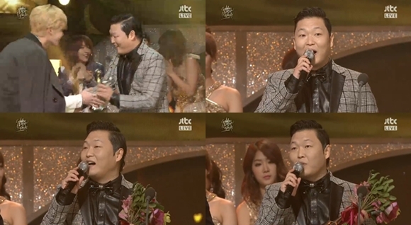 싸이는 16일 오후 서울 경희대학교 평화의전당에서 열린 '제28회 골든디스크 시상식'에서 '젠틀맨'으로 음원대상을 받고 "오랜만에 뵙는데, 인기가 상당하네요. 감사합니다. 작년에도 이 상 주셔서 현장에서 받고 싶었는데 영상으로 받아서 죄송했습니다. 올해 신곡 거의 마무리 됐으니까. 신나는 곡 갖고 나와서 재미있는 무대 보여드리겠습니다"라고 말했다.
