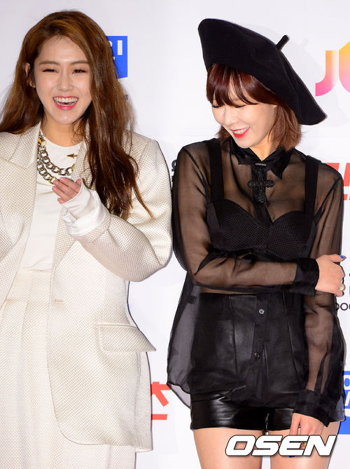 시상식에 앞서 가수 포미닛 허가윤, 현아가 포토타임을 하고 있다.