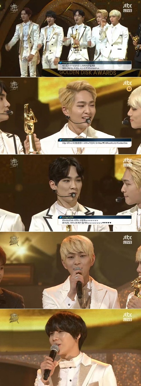 샤이니는 16일 오후 서울 경희대학교 평화의 전당에서 생방송으로 진행된 제28회 골든디스크 시상식에서 음원부문 쎄시 아시아 아이콘상, 음반부문 인기상, 본상 등 3개의 트로피를 거머쥐어 눈길을 사로잡았다.