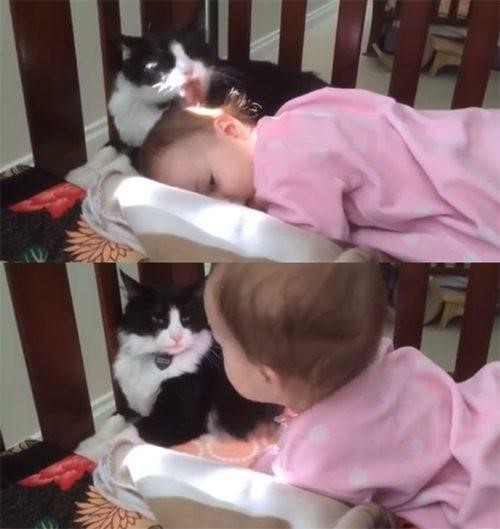 이 영상에는 고양이와 아기가 나온다. 특이하게도 엎드려 누워있는 아기의 머리를 고양이가 핥고 있다. 아기는 얌전하게 누워 있다가 고양이가 자신을 쓰다듬는 것 같자 벌떡 상체를 일으켜 고양이를 쳐다본다.