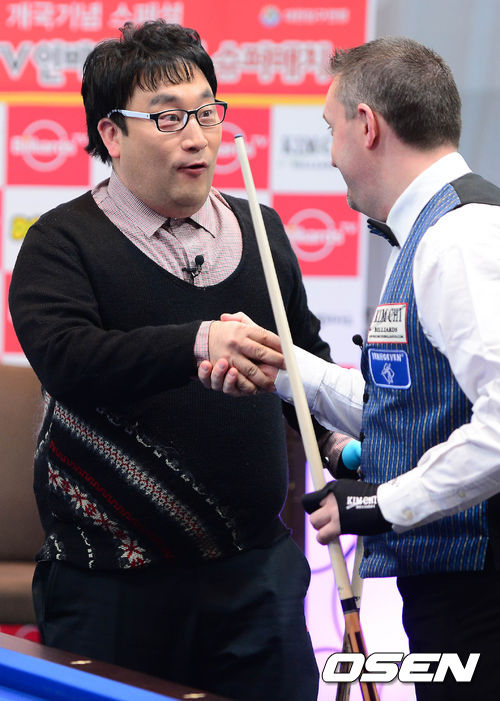 17일 오전 서울 신도림 디큐브시티에서 열린 '빌리어즈TV 인비테이셔널 슈퍼매치'에서 이혁재가 쿠드롱의 샷을 보고 놀라운 표정을 짓고 있다.