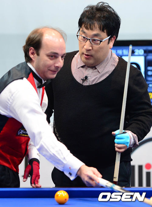 17일 오전 서울 신도림 디큐브시티에서 열린 '빌리어즈TV 인비테이셔널 슈퍼매치'에서 이혁재가 산체스로부터 원포인트 레슨을 받고 있다.