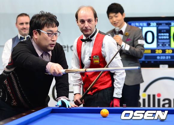 17일 오전 서울 신도림 디큐브시티에서 열린 '빌리어즈TV 인비테이셔널 슈퍼매치'에서 이혁재가 산체스로부터 원포인트 레슨을 받고 있다.