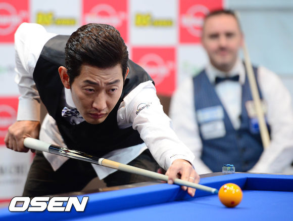 17일 오후 서울 신도림 디큐브시티에서 열린 '빌리어즈TV 인비테이셔널 슈퍼매치'에서 김창렬이 샷을 하고 있다.