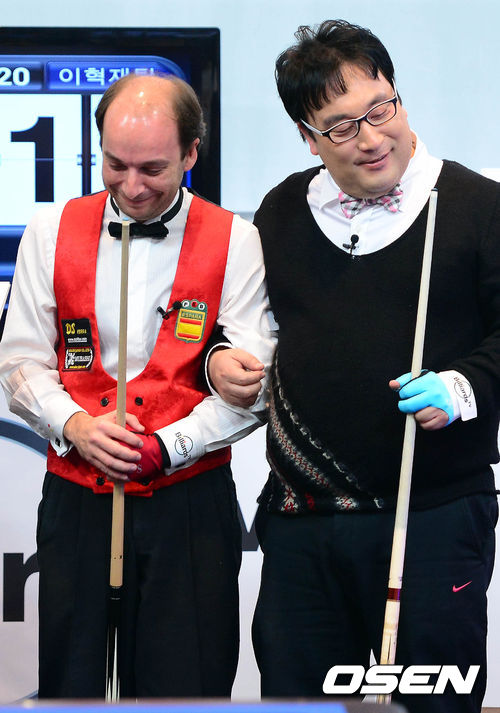 17일 오후 서울 신도림 디큐브시티에서 열린 '빌리어즈TV 인비테이셔널 슈퍼매치'에서 산체스-이혁재 팀이 패배하자 아쉬운 표정을 짓고 있다.