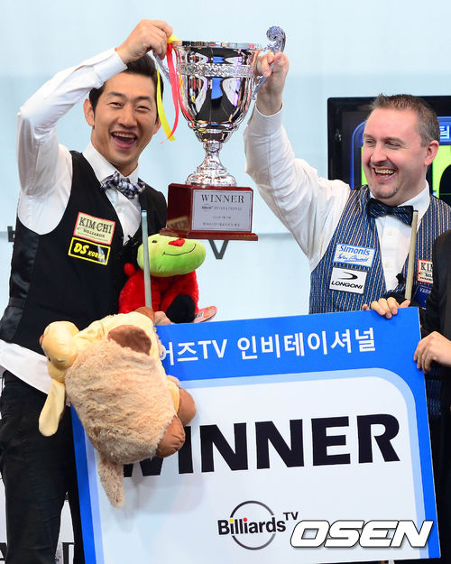 17일 오후 서울 신도림 디큐브시티에서 열린 '빌리어즈TV 인비테이셔널 슈퍼매치'에서 김창렬과 쿠드롱이 우승 트로피를 들고 기뻐하고 있다.