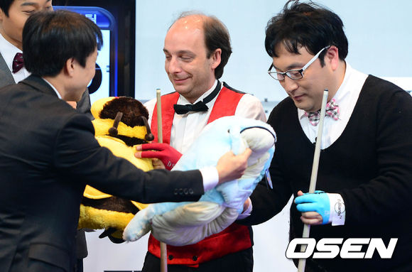 17일 오후 서울 신도림 디큐브시티에서 열린 '빌리어즈TV 인비테이셔널 슈퍼매치'에서 산체스와 이혁재가 상품으로 인형을 받고 있다.