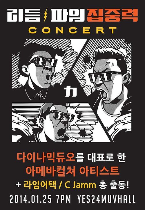 CJ E&M 음악사업부문 콘서트사업부 측에 따르면 ‘2014 리듬파워 집중력 콘서트’에는 다이나믹듀오를 필두로 한 아메바컬쳐 사단이 지원사격을 할 예정이며 이 외에도 라임어택, 씨잼(C Jamm)이 게스트로 참여한다.
