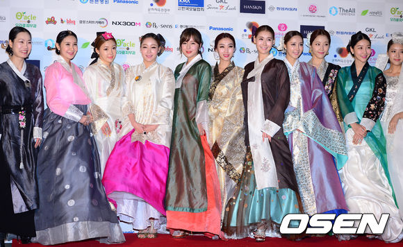 17일 오후 서울 올림픽공원 올림픽홀에서 열리는 2014 아시아모델 시상식에 앞서 레이싱 모델들이 한복을 입은채 포즈를 취하고 있다