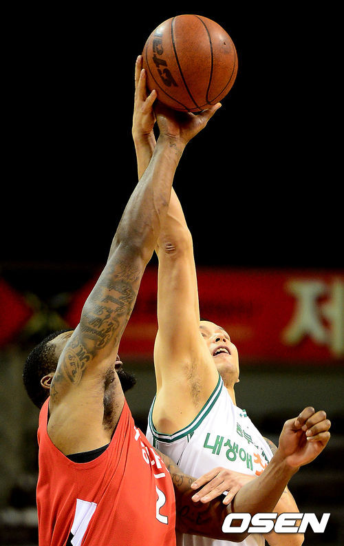 17일 오후 안양실내체육관에서 열린 'KB국민카드 2013-2014 프로농구' 안양KGC와 원주동부의 경기, 1쿼터 경기 시작과 함께 KGC 에반스와 동부 이승준이 점프볼을 하고 있다.