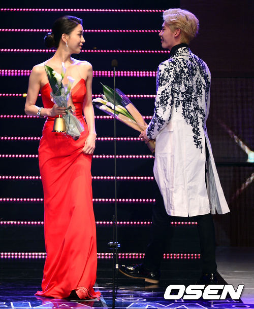 17일 오후 서울 올림픽공원 올림픽홀에서 열린 2014 아시아모델 시상식에서 AMAF 한국 모델 스타상을 수상한 배우 한고은이 이종석을 바라보고 있다.