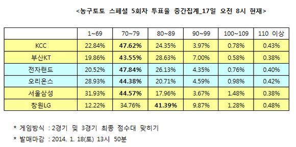 국내 프로농구(KBL) 3경기 대상 농구토토 스페셜 5회차 투표율 중간집계
