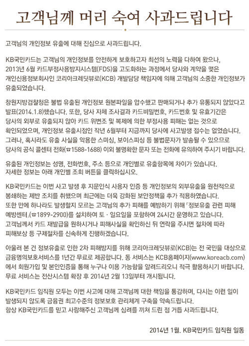 KB국민카드, 롯데카드, NH농협카드는 18일 피해 회원들을 위해 홈페이지에서 카드사 정보 유출 확인이 가능한 전용창을 홈페이지에 개설했다고 밝혔다. 해당 카드 회원들은 홈페이지에 개설된 전용창에 이름과 주민번호를 입력해 개인정보 유출 여부와 정보 내역을 실시간 확인 가능하다.
