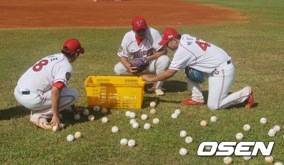 KIA 타이거즈 투수조의 1차 캠프가 차려진 괌 파세오 구장에서 선수들이 훈련 후 뒷정리를 하고 있다.