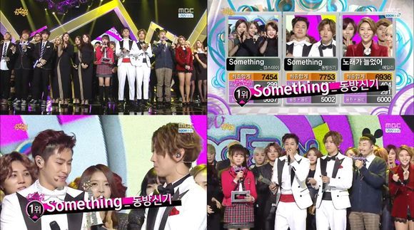 동방신기는 18일 오후 3시 50분 방송된 MBC '쇼!음악중심'에서 ‘섬씽(Something)’으로 걸스데이의 ‘섬씽(Something)’과 에일리의 ‘노래가 늘었어’를 제치고 1위에 올랐다.