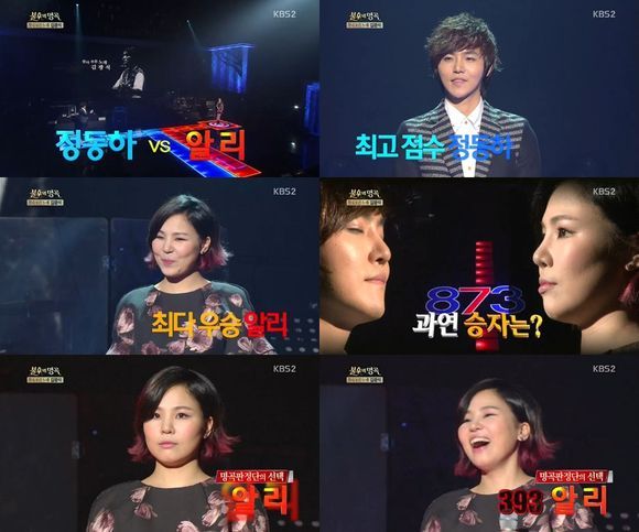 알리는 18일 오후 방송된 KBS 2TV '불후의 명곡-전설을 노래하다(이하 '불후')'에서 故김광석 편을 맞아 '먼지가 되어'로 최대의 라이벌, 정동하를 누르고 1승을 차지했다.