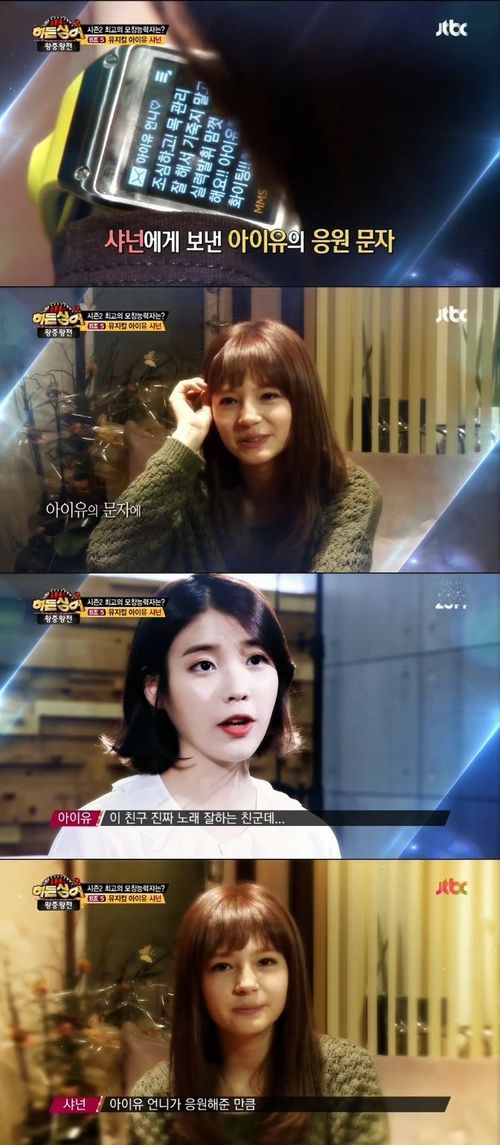 샤넌은 18일 오후 11시 방송된 JTBC 예능프로그램 '히든싱어2'에서 왕중왕전 무대를 앞두고 인터뷰를 하던 중 아이유가 보낸 문자를 받았다.