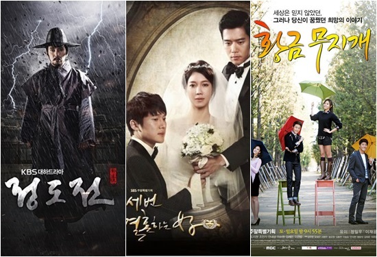 KBS 1TV '정도전', SBS '세 번 결혼하는 여자', MBC '황금무지개'가 주말극 왕좌를 놓고 치열한 각축전을 벌이고 있다.