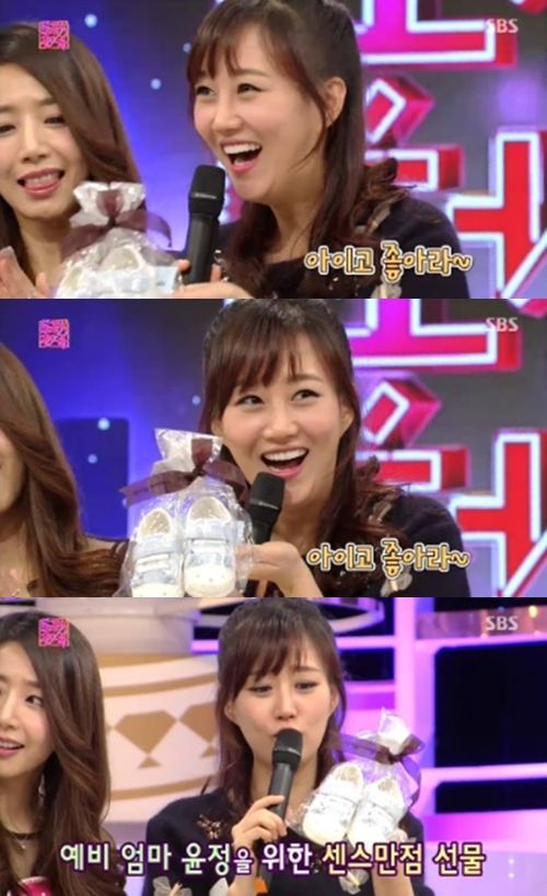 가수 장윤정이 조장혁으로부터 아기 선물을 받은 후 함박웃음을 지어보였다.