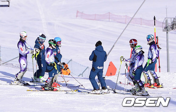 19일 강원도 평창 알펜시아 리조트에서 진행된 '소치 동계올림픽 스키 미디어데이 행사에서 알파인 스키 대표팀 선수들이 훈련을 하고 있다.