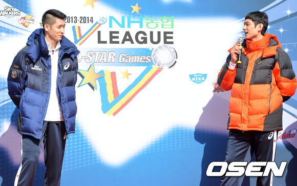 19일 오후 경기도 수원시 실내체육관에서 열리는 'NH농협 2013~2014 V리그 올스타전'을 앞두고 문성민과 김요한이 대화를 나누고 있다.