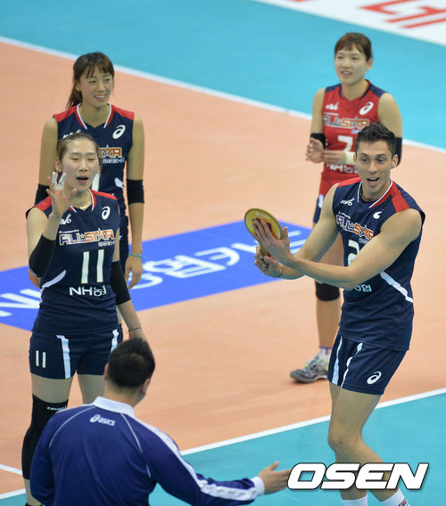 19일 오후 경기도 수원시 실내체육관에서 'NH농협 2013~2014 V리그 올스타전'이 열렸다. V스타팀 마이클이 여자부 경기에 교체를 요청하고 있다.