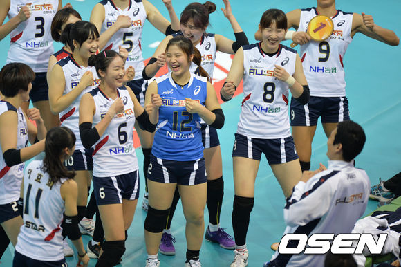 19일 오후 경기도 수원시 실내체육관에서 'NH농협 2013~2014 V리그 올스타전'이 열렸다. K스타팀 선수들이 득점을 올린 뒤 고희진을 향해 세레모니를 펼치고 있다.