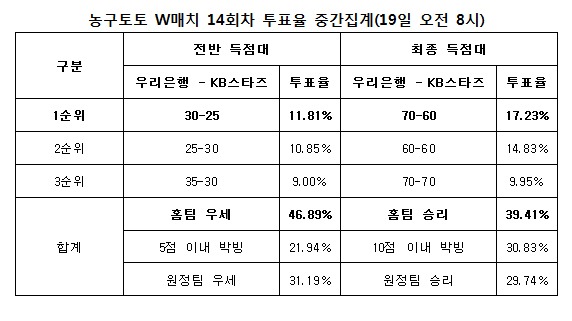 2013-2014시즌 농구토토 W매치 14회차 투표율 중간집계 결과…우리은행 우세 예상