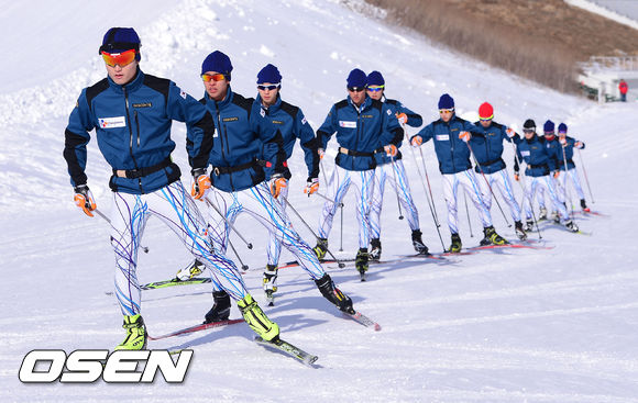 19일 강원도 평창 알펜시아 리조트에서 진행된 '소치 동계올림픽 스키 미디어데이 행사에서 크로스컨트리 대표팀이 훈련을 하고 있다.