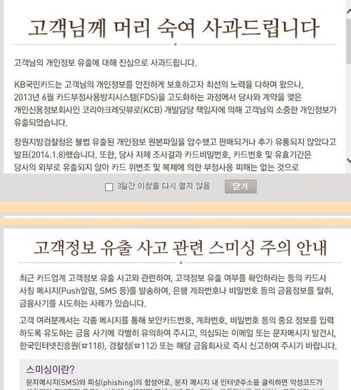 해당 카드사는 홈페이지에 사과문과 함께 정보유출 여부를 알 수 있는 전용코너를 따로 만들었다. 고객들은 이름과 주민번호 등 개인정보를 입력하면 정보유출을 확인할 수 있다. 그러나 또 다시 개인정보 수집과 이용에 동의를 해야 하는 등 번거로운 절차로 불만을 낳게 하고 있다.