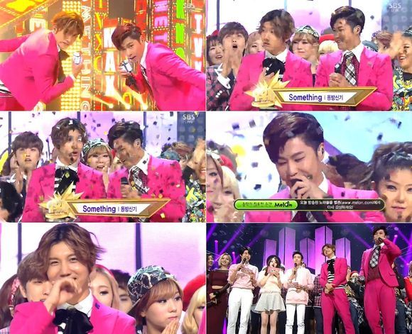 동방신기는 19일 오후 방송된 '인기가요'에서 '섬씽(Something)'으로 1월 셋째주 1위 후보에 올라 걸스데이 '섬씽', 에일리 '노래가 늘었어'를 제치고 1위의 영예를 안았다.