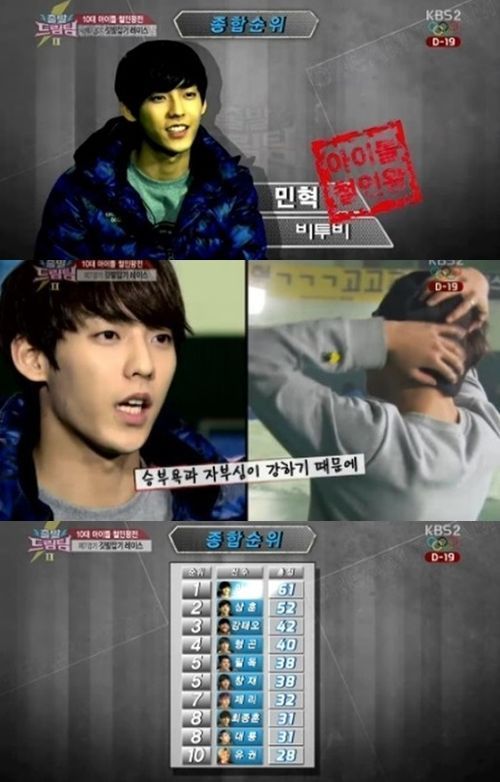 그룹 비투비의 민혁이 KBS 2TV '출발 드림팀 시즌2'에서 10대 아이돌 철인왕전에서 종합 우승을 차지, '아이돌 육상 대회' 때의 실력을 고스란히 뽐냈다.