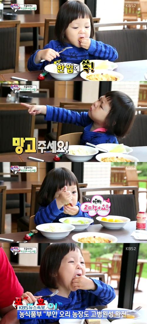 '슈퍼맨이 돌아왔다'의 추사랑이 변비를 해결한 후 폭풍먹방을 선보였다.