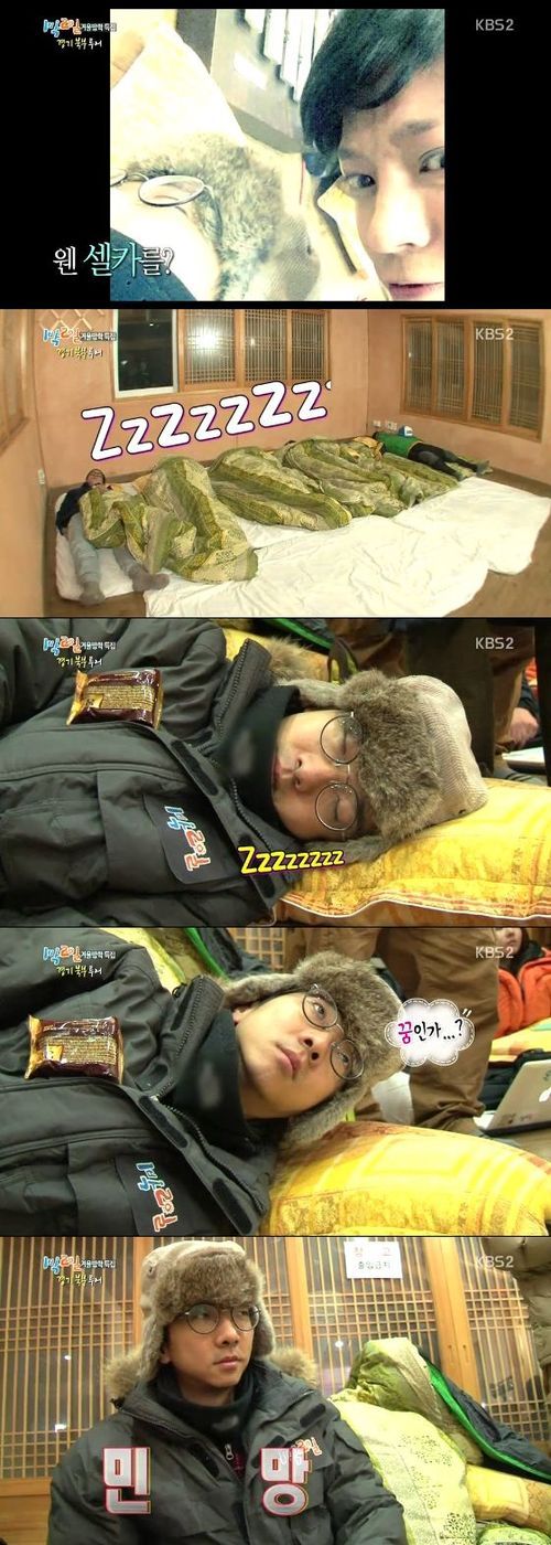 이에 정준영은 유PD가 잠든 것을 포착, 셀카를 찍으며 놀릴 거리를 만들었다. 또 차태현은 "PD가 먼저 잠 드는데, 우리도 저녁 복불복 하지 말고 그냥 자자"고 말했다.