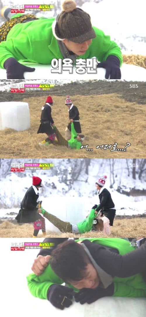 지석진은 19일 방송된 SBS 예능 프로그램 '일요일이 좋다 - 런닝맨'에서 볏짚정복 게임을 진행하던 중 김종국, 이광수에게 들려 끌려 나갔다.