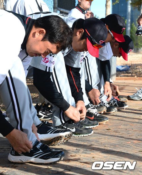 봉중근을 비롯한 투수조가 본격적인 훈련에 앞서 스파이크 끈을 동여메고 있다./spjj@osen.co.kr