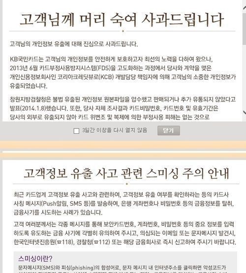 KB국민카드, 롯데카드, NH농협카드는 18일 피해 회원들을 위해 홈페이지에서 카드사 정보 유출 확인이 가능한 전용창을 홈페이지에 개설했다고 밝혔다. 이들은 최근 코리아크레딧뷰로(KCB)를 통해 최근 1억여 건에 달하는 대규모 개인정보 유출사고가 발생한 사실이 알려져 뭇매를 맞고 있는 카드사들이다.