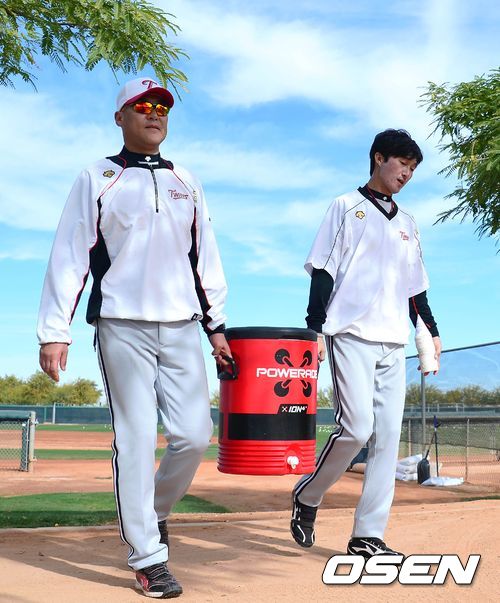 강상수 코치와 이성렬이 후배들을 위해 물통을 옮기고 있다./spjj@osen.co.kr