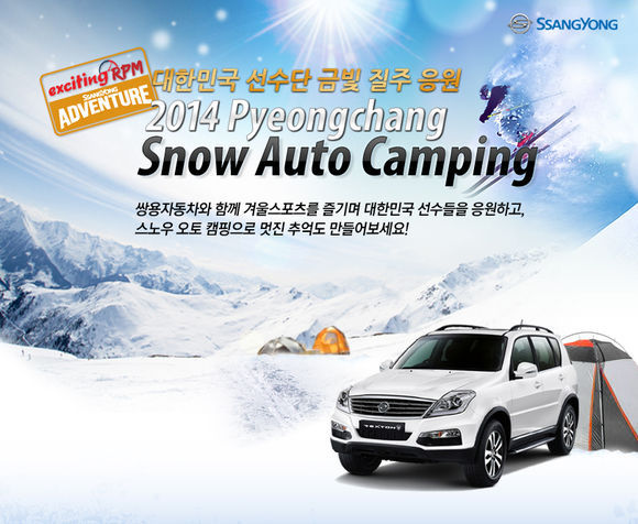 쌍용차는 오는 2월 15일과 16일 1박 2일 일정으로 강원도 평창군 솔섬오토캠핑장에서 80개 팀, 총 320여 명(4인 가족 기준)을 초청해 'Ssangyong Adventure: exciting RPM - 2014 평창 스노 오토 캠핑(2014 Pyeongchang Snow Auto Camping)'을 개최하기 위해 20일부터 오는 2월 5일까지 참가자를 모집한다.
