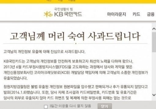 [OSEN=이슈팀] 국민은행 개인정보 유출 확인이 누리꾼들의 감정을 폭발시켰다. 1억건 이상의 개인정보 유출 사실이 알려진 KB국민카드, 롯데카드, NH농협카드의 홈페이지는 유출 여부 확인 서비스를 개시한 지난 17일 밤부터 본인의 정보 유출을 확인하려는 고객들로 넘처나고 있는 가운데 국민은행 개인정보 유출 확인과정에서 주민번호 등 개인정보를 다시 입력해야 하자 이용자들이 불만을 토로하고 있다.