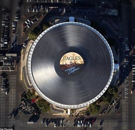 더욱 놀라운 사실은 이 레코드판이 시속 27km로 돌고 있다는 사실로 124m짜리 거대 레코드판은 미국 캘리포니아 잉글우드 아레나 포럼에 설치됐다. 아레나 포럼은 124m짜리 거대 레코드판이 그룹 '이글스'의 공연 홍보로 설치됐고, '호텔 캘리포니아'로 레코드판을 만들었다고 발표했다.