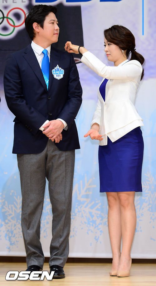 20일 오후 서울 양천구 SBS 목동사옥에서 열린 2014 소치 동계올림픽 해설자-캐스터 기자간담회서 박선영 아나운서가 박찬민 아나운서 옷에 묻은 먼지를 제거해주고 있다.