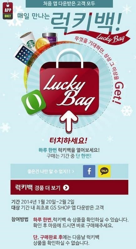 GS샵이 '럭키백' 이벤트가 누리꾼들의 관심 속에 '화제어'로 등극했다. GS샵은 20일 새로 모바일 애플리케이션을 다운로드하는 고객들을 대상으로 '럭키백' 이벤트를 실시한다.