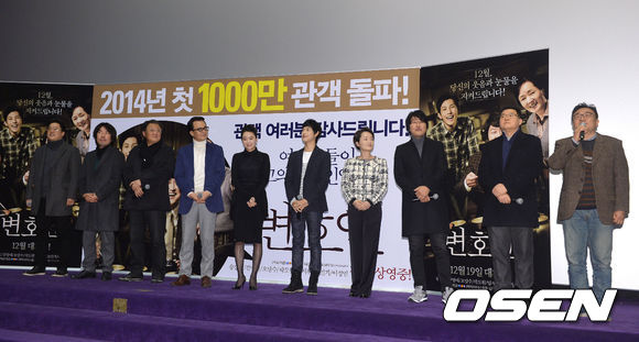 천만 관객을 돌파한 영화 '변호인' 측은 관객들의 성원에 보답하고자 이 같은 자리를 마련한 것. 주연배우 송강호와 김영애, 오달수, 곽도원, 임시완 등 배우들이 총출동 했다.