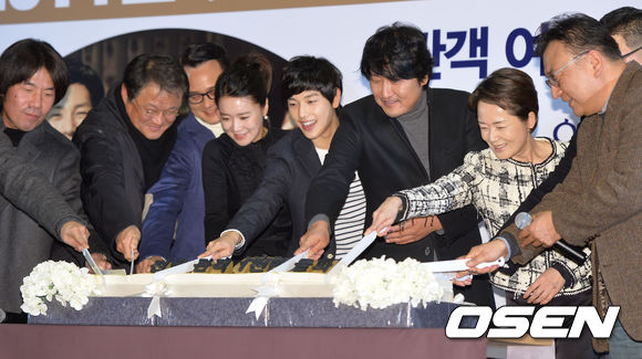 출연배우들과 양우석 감독, 최재원 대표가 케이크 커팅 행사를 갖고 있다.